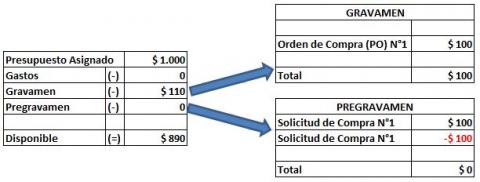 Ahora suponemos que la Unidad de Adquisiciones genera una Orden de Compra (PO) N°1 por $110 asociada a nuestra Solicitud de Compra N°1, en el momento de la realización del control presupuestario de la PO automáticamente se hace una rebaja del PREGRAVAMEN por el monto de la Solicitud de Compra ($100) y se imputa en el GRAVAMEN el valor de la Orden de Compra ($110) como lo muestra el siguiente cuadro:
