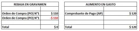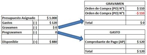 Por ultimo, suponemos que la factura viene por un monto de $120 y al momento que se controla el presupuesto al comprobante de pago (AP) en Contabilidad, automaticamente se hace una rebaja al GRAVAMEN por el valor de la Orden de Compra (PO) N°1 ($110) y se imputa en el GASTO el Comprobante de Pago (AP) los $120 de la factura como se muestra en el siguiente cuadro: